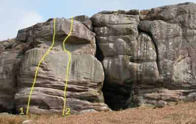 The crag is in two sections - The Right has 3 pillars, the Left is split by a large cave with a Diff/VD thrutch coming out of it.