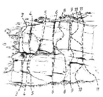 The routes are described from left to right starting with the main face. Most of the belays are well back from the top of the crag on trees or a small rock outcrop, but all can be reached on 50m ropes. The best way off the top of the crag is to the right.