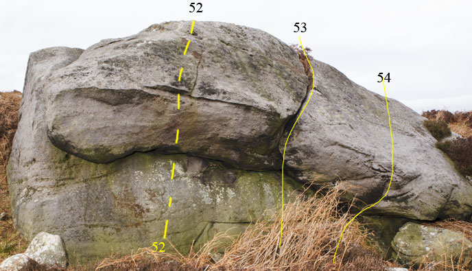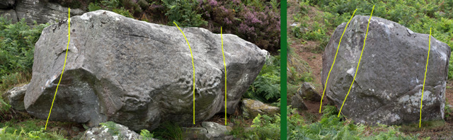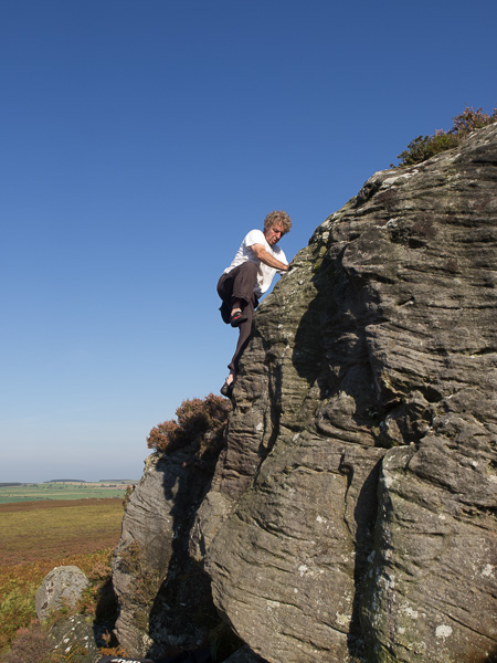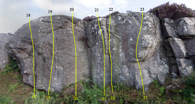 The crag is described from left to right. There are two sections separated by several hundred metres. Starting from the left there are a couple of easy slabs before reaching The Pinnacles area - a couple of fine five metre high blocks followed by a bulging wall which tails off into easier and lower territory. A hundred metres right of The Pinnacles is the Punters section, with half a dozen nice easyish problems. The right hand section consists of a low discontinuous wall with a couple of boulders underneath, then a fine clean vertical wall, Hunters Wall, bounded by a neb on the left. A prominent feature of Hunters is the collection of ironstone nodules sticking out of it. None of these have snapped off yet... Another couple of hundred metres right is a prominent outcrop in the shape of a pendulous breast. An indistinct path can be followed along the bottom of the crag from the Pinnacles area to Hunters, which is useful when the bracken is in full swing. ![]() Far East End
