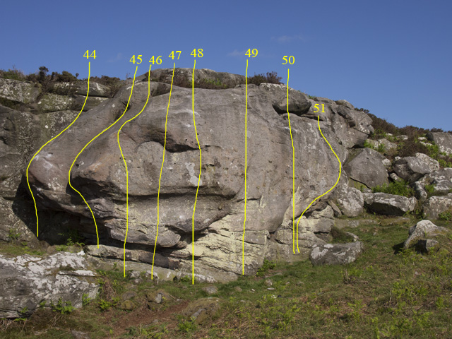 The bulging mineralised wall right of the gully. There is an undercut crack on the left, followed by three sets of flakes on the headwall, then a groove and a couple of problems at the RH end. The continuation is an easier wall with a few problems.