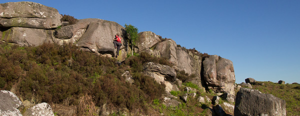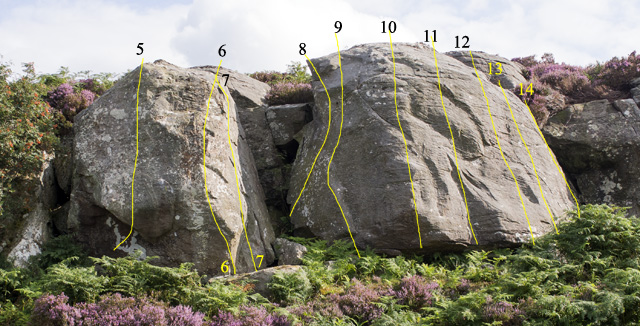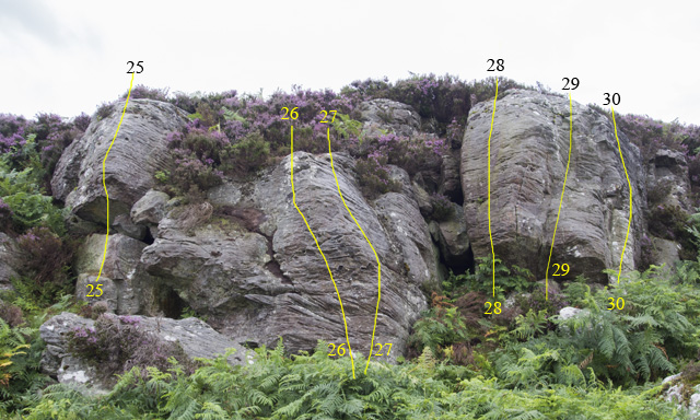 At the first pinnacle there is a heathery ramp leading up to the problems.